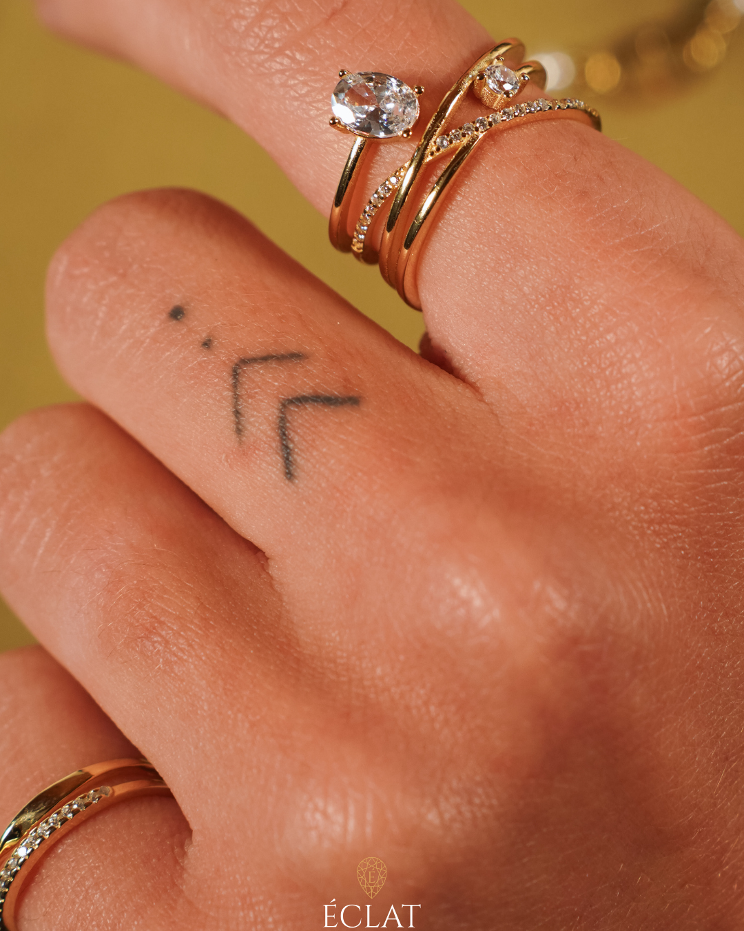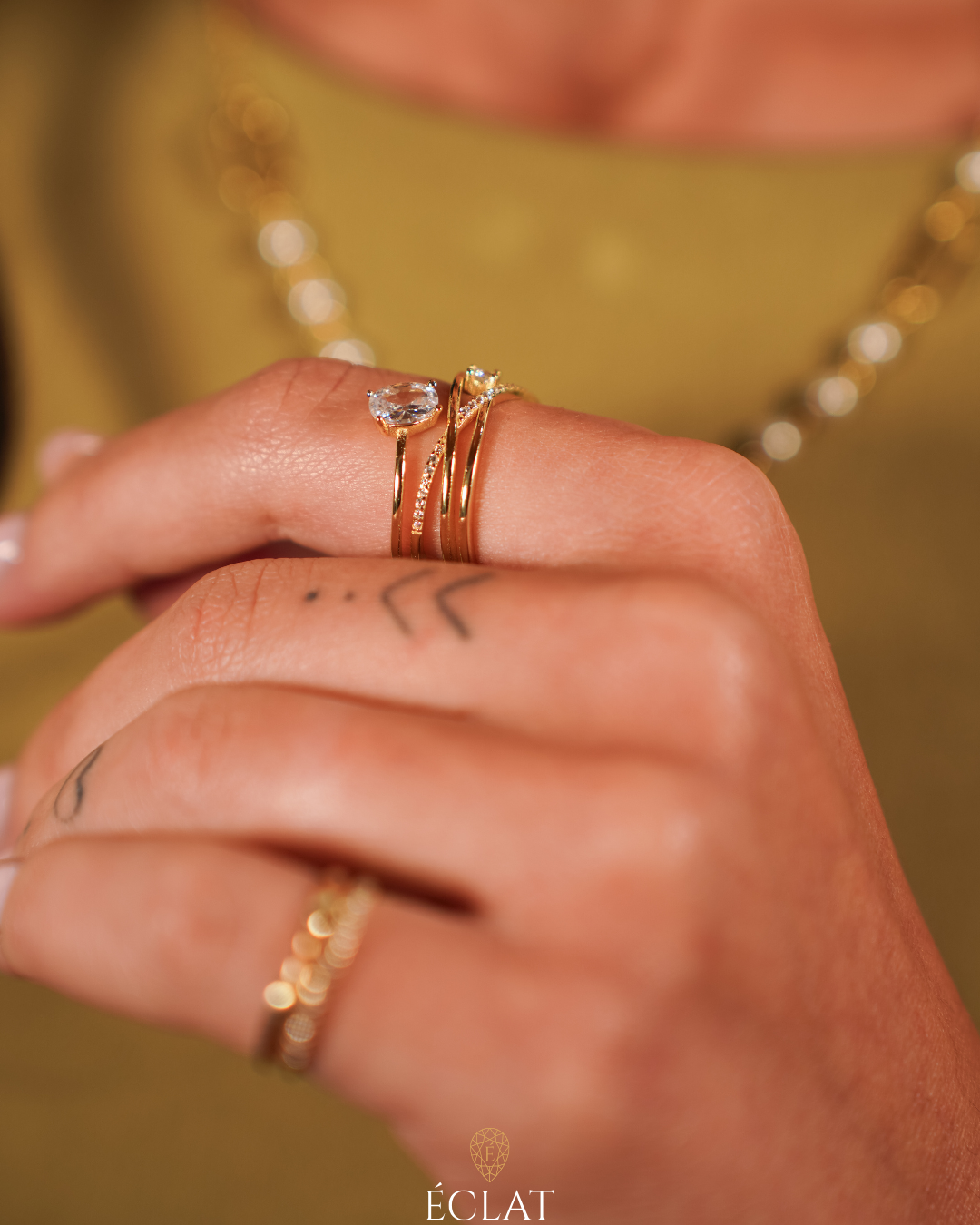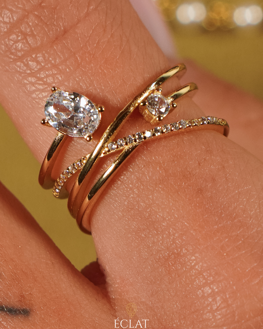 L'Anello Intreccio Luminoso di ÉCLAT Gioielli è l'espressione massima dell'eleganza moderna. Realizzato in Argento Sterling 925 e rifinito con una lussuosa placcatura in oro, questo gioiello presenta un design multi-fascia che si avvolge con grazia al dito. Due fasce pulite si intersecano con una terza, impreziosita da un pavé di Zirconi Cubici luminosi. Un magnifico Zircone ovale taglio brillante e un dettaglio rotondo più piccolo aggiungono un tocco di luce spettacolare. Perfetto per chi cerca un anello in argento 925 di tendenza che catturi lo sguardo.