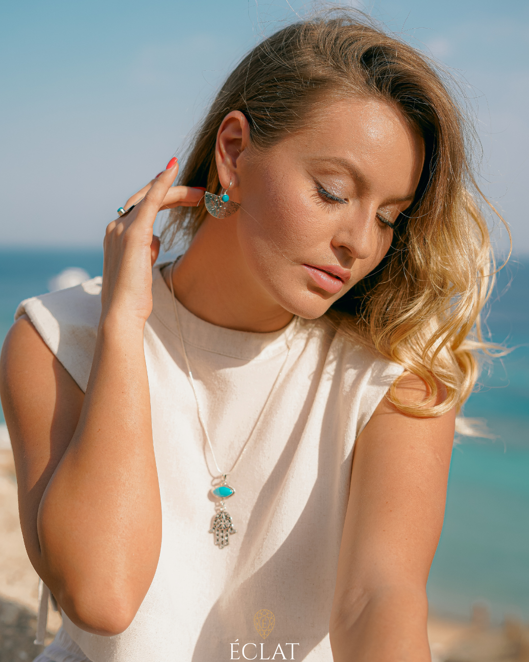 Porta con te la forza dei simboli e la bellezza delle pietre naturali con la Collana "Occhio di Fatima" di ÉCLAT. Questo gioiello unisce due potenti amuleti in un design elegante e significativo.
