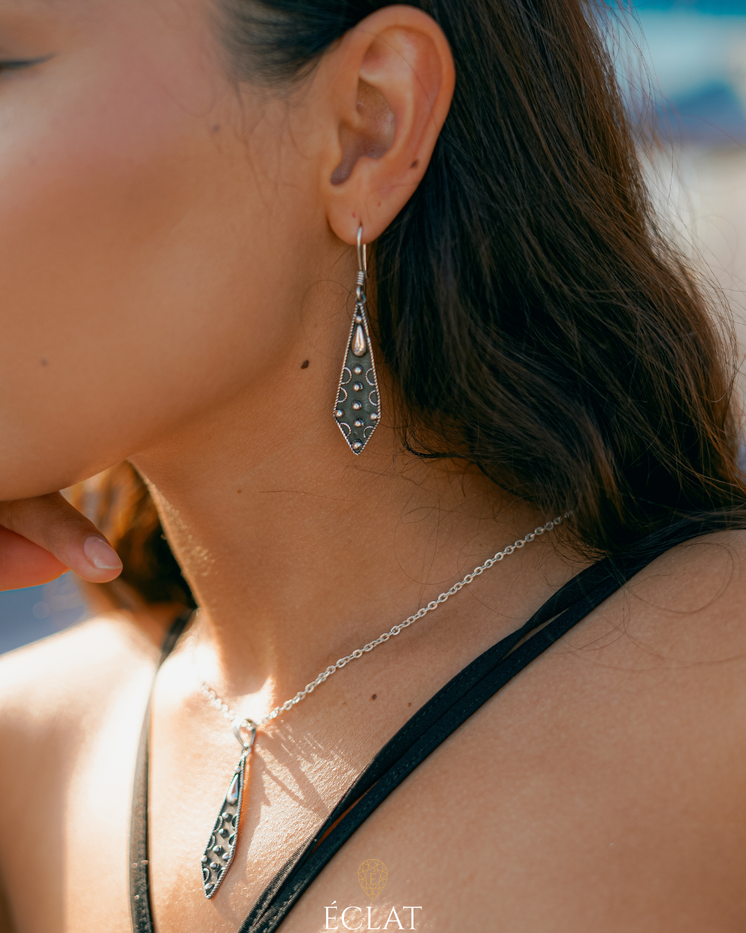 Lasciati avvolgere dal fascino millenario dell'oasi di Siwa con gli orecchini "Gocce del Deserto". Questi pendenti in argento puro catturano l'essenza dell'antica arte Siwana, caratterizzata da un design Berbero che risuona con le tradizioni delle tribù del deserto.